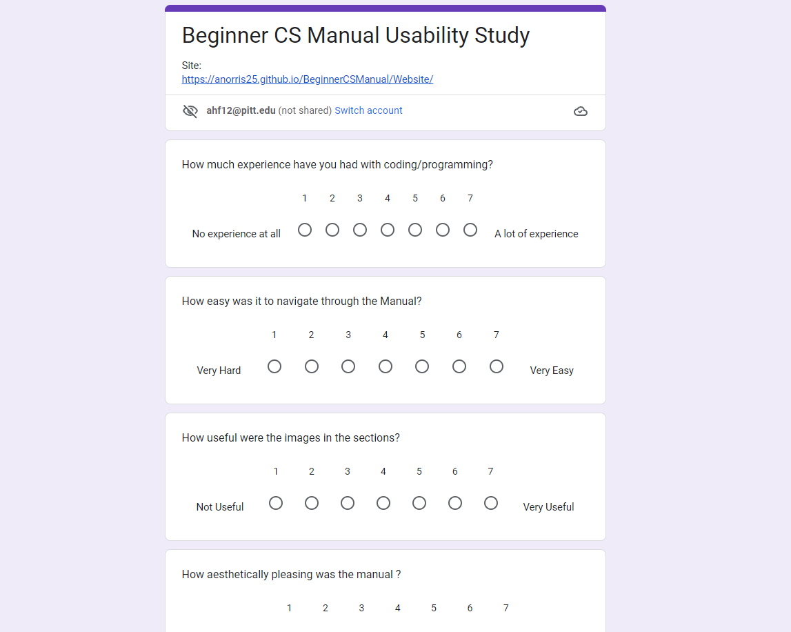 This is a usability study I made in my Intro to Techincal Writing class, in order to be able to understand how users interacted with our Beginner Programming manual. This data would be used to improve the usability of the manual.